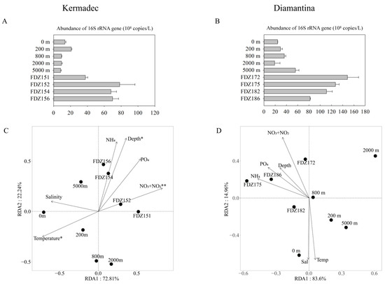 The abundance of the 16S rRNA gene at the WC and BBL of the Kermadec Trench (A) and the Diamantina Trench (B). Biplot of the redundancy analysis integrating environmental parameters and the microbial communities in the WC and BBL of the Kermadec Trench (C) and the Diamantina Trench (D). * and ** stand for p < 0.05 and p < 0.01.