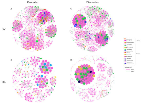 The networks analysis among archaeal and bacterial groups in the WC and BBL of the Kermadec Trench (A,B) and the Diamantina Trench (C,D). The network represents relationships between co-occurring ecosystems, the edges represent co-occurrence relationships consistent at the 0.6 correlation level, and the nodes represent archaeal and bacterial taxa.