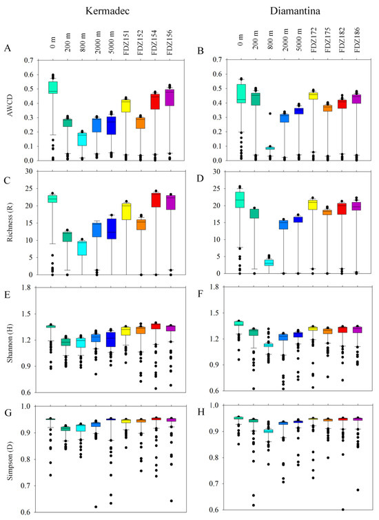 Box plots of the microbial metabolic activity of AWCD (A,B), Richness index (C,D), Shannon index (E,F), and Simpson index (G,H) in the WC and BBL of the Kermadec Trench and the Diamantina Trench.