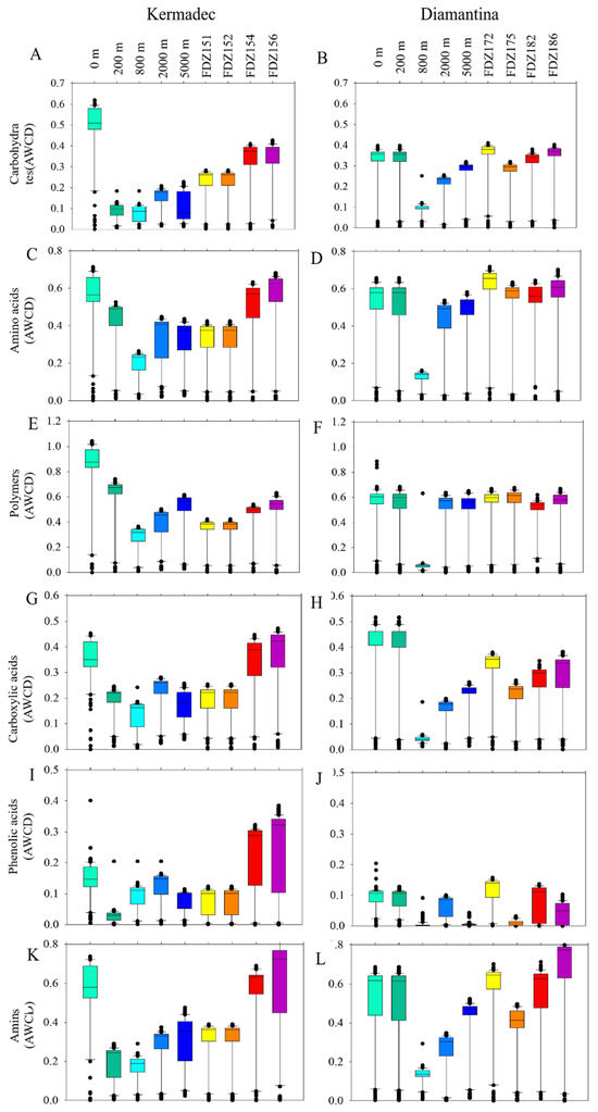 Box plots of the utilization capability of the six major carbon groups, carbohydrates (A,B), amino acids (C,D), polymers (E,F), carboxylic acids (G,H), phenolic acids (I,J), and amines (K,L) by microbes in the WC and the BBL of the Kermadec Trench (left panel) and Diamantina Trench (right panel).