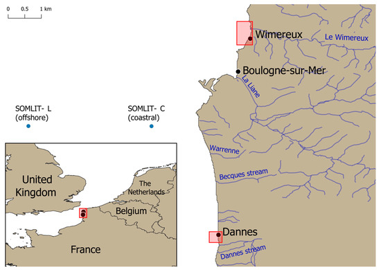 Location of the two mussel harvesting areas on the foreshores of Wimereux and Dannes (red boxes) and the two SOMLIT stations (blue dots).
