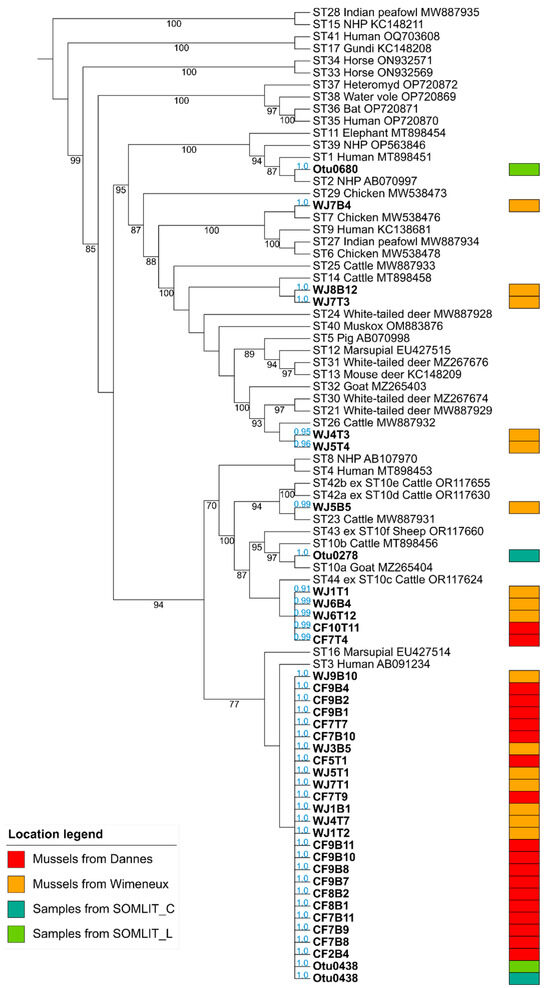 In a second step, the qPCR products of the 82 positive samples (both gills and intestinal tracts) obtained herein were purified, then directly sequenced. Through the analysis of the corresponding sequence chromatograms, more than half of them exhibiting double traces (47/82, 57.3%) reflecting mixed infections, meaning more than one ST present in the same sample (Table 2). This proportion of mixed infections in the positive samples analyzed was of the same order of importance for mussels collected at Wimereux (18/34, 52.9%) as for those sampled at Dannes (29/48, 60.4%). High proportions of mixed infections have also been reported in numerous other animal groups, as recently described [5,29,51], definitely related to multiple sources of contamination in their respective environment. The remaining 35 chromatograms reflected single infections in either gills or intestinal tract of mussels from the two sampling points. The corresponding sequences were subsequently included in a large phylogenetic analysis allowing for the successful and definite subtyping of all the mussels isolates according to likelihood values (0.91 to 1.0) (Figure 2). The few isolates identified from SOMLIT marine stations (Table 3) were also integrated in the same tree reconstruction and subtyped.