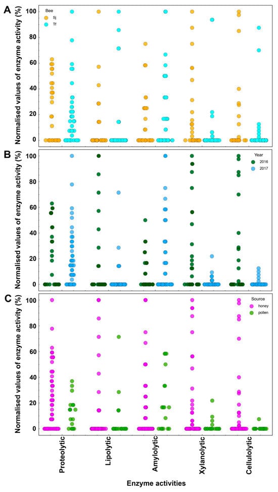 Salomón, V.M.; Hero, J.S.; Morales, A.H.; Pisa, J.H.; Maldonado, L.M.; Vera, N.; Madrid, R.E.; Romero, C.M. Microbiological Diversity and Associated Enzymatic Activities in Honey and Pollen from Stingless Bees from Northern Argentina. Microorganisms 2024, 12, 711. https://doi.org/10.3390/microorganisms12040711