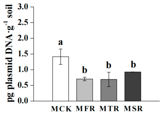 Abundance of Plasmodiophora brassicae in response to straw application. MCK represents no straw addition; MFR, MSR, and MTR represent one-year, two-year and three-year addition of rice straw, respectively. Error bars indicate the standard error, and different letters indicate significant differences at the 0.05 level (Tukey’s HSD test).