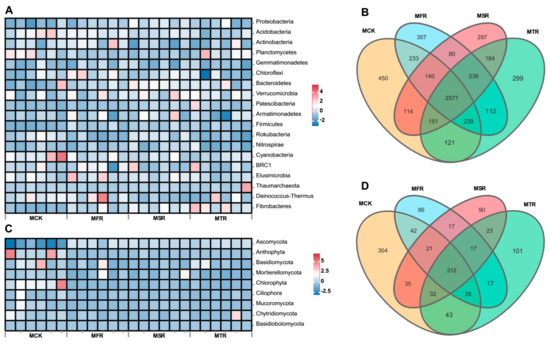 Heatmap of relative abundances at the phylum level for bacteria (A) and fungi (B), and Venn diagram analyses of OTUs for bacteria (C) and fungi (D). The rows were normalized with the Z-score normalization algorithm in the heatmap. MCK represents no straw addition; MFR, MSR, and MTR represent one-year, two-year and three-year addition of rice straw, respectively.