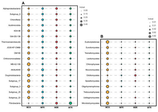 The indicator analysis at the class level for bacteria (A) and fungi (B). MCK represents no straw addition; MFR, MSR, and MTR represent one-year, two-year and three-year addition of rice straw, respectively.