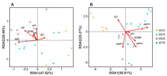 Redundancy analysis (RDA) of the relationship between the bacterial (A) and fungal (B) community structures and environmental variables in straw addition treatments. The environmental variables with statistical significance are represented by arrows. MCK represents no straw addition; MFR, MSR, and MTR represent one-year, two-year and three-year addition of rice straw. SOM, AN, AP, AK and EC represent soil organic matter, inorganic nitrogen, available phosphorus, available potassium and electrical conductivity, respectively. * p < 0.05; ** p < 0.01.