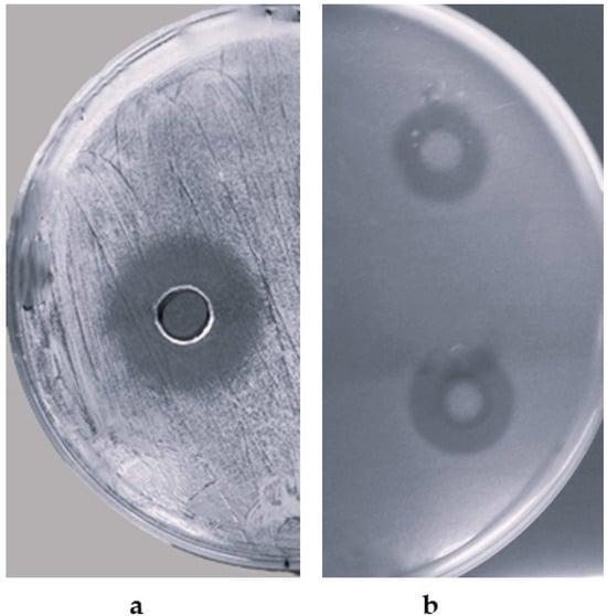 Furthermore, the CFS from the strain with the best antimicrobial activity, i.e., B. siamensis CPAY1, was tested by agar well diffusion assay [9] against the microorganisms found to be particularly susceptible in the initial screening. CFSs were obtained from 10 mL overnight bacterial cultures by centrifugation (10,000× g for 20 min at 4 °C), followed by filtration with a 0.45 µm-pore-size filter (Millipore Corp., Bedford, MA, USA). The potential bacterial contamination of CFSs was excluded by incubating 1 mL of each CFS at 37 °C and checking the turbidity (from 24 h to 72 h). In the well agar diffusion method, the negative control is given by the TSB.