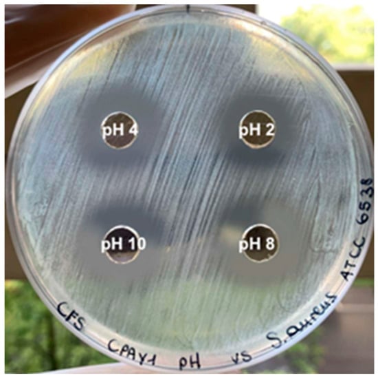 The antimicrobial activity of the CPAY1 CFS was stable after treatment at 121 °C for 15 min. The antimicrobial activity was inhibited after treatment with proteolytic enzymes, indicating that the antimicrobial substance might be proteinaceous. Activity was maintained over a wide range of pHs (Figure 2), during storage at room temperature and after 6 months at +4 °C.