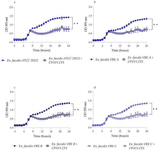Time–kill studies of CPAY1 CFS against (a) E. faecalis ATCC 29212, (b) E. faecalis VRE A, (c) E. faecalis VRE B, and (d) E. faecalis VRE C viable cells. Values of p < 0.01 (**) was considered significant by t-test and ANOVA with Bonferroni correction; ns means no significant. Results were expressed as mean ± SD of the three determinations (error bar = S.D.; n = 3).