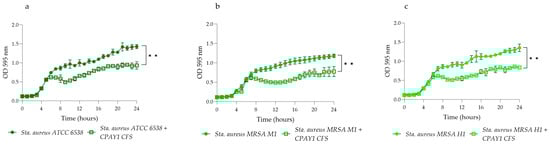 Time–kill studies of CPAY1 CFS against (a) S. aureus ATCC 6538, (b) S. aureus M1, and (c) S. aureus H1 viable cells. Values of p < 0.01 (**) was considered significant by the unpaired t-test performed on the AUC values of each experimental group. Results were expressed as mean ± SD of the three determinations (error bar = S.D.; n = 3).
