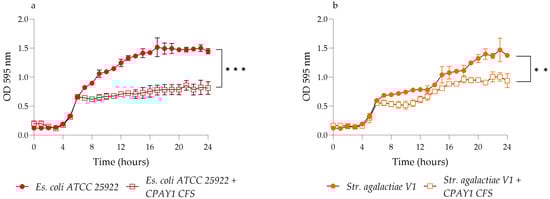 Time–kill studies of CPAY1 CFS against (a) E. coli ATCC 25922, and (b) S. agalactiae V1 viable cells. Values of p < 0.01 (**) and p < 0.001 (***) were considered significant by the unpaired t-test performed on the AUC values of each experimental group. Results were expressed as mean ± SD of the three determinations (error bar = S.D.; n = 3).