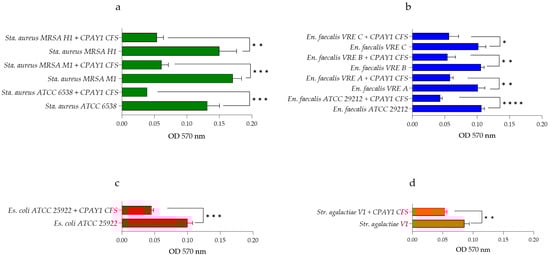 Anti-biofilm activity of CPAY1 CFS against (a) S. aureus strains, (b) E. faecalis strains, (c) E. coli ATCC 25922, and (d) S. agalactiae V1. Results show the mean optical densities (OD) at 570 nm from three determinations. Values of p < 0.05 (*), p < 0.01 (**), p < 0.001 (***), and p < 0.0001 (****) were considered significant by t-test and ANOVA with Bonferroni correction. Results were expressed as mean ± SD of the three determinations (error bar = S.D.; n = 3).