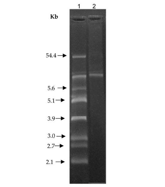 Figure 7 shows the plasmid profile of the B. siamensis CPAY1. The presence of plasmids could not be observed and only the chromosomal band could be detected. Therefore, we hypothesized a chromosomal localization for the gene coding for the bioactive compound(s).