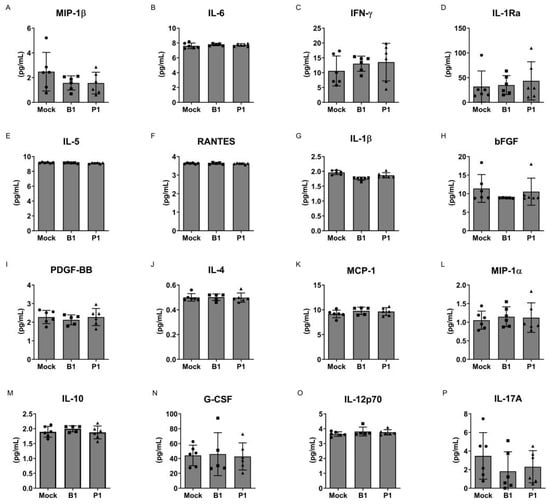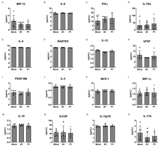 Cytokine profile of SARS-CoV-2-treated mononuclear cells. Cytokine analysis of the supernatant from non-treated mononuclear cells (mock group), mononuclear cells treated with the B.1 strain (B1) and mononuclear cells treated with the P.1 variant (P1). (A) MIP-1β, (B) IL-6, (C) IFN-γ, (D) IL-1Ra, (E) IL-5, (F) RANTES, (G) IL-1β, (H) bFGF, (I) PDGF-BB, (J) IL-4, (K) MCP-1, (L) MIP-1α, (M) IL-10, (N) G-CSF, (O) IL-12p70 and (P) IL-17A. No significant differences were observed between the groups. Statistical comparisons were performed against the control group using the Student’s t-test. Multiple comparisons among the experimental groups were conducted using two-way analysis of variance (ANOVA) followed by Dunnett’s test.