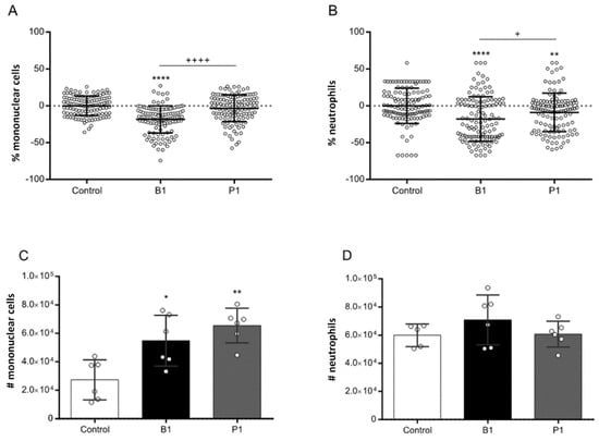 Microscopy analysis of mononuclear cell and neutrophil percentage following SARS-CoV-2 treatment. Microscopy-based analysis of (A,C) mononuclear cells and (B,D) neutrophils obtained from patients with severe COVID-19. The analysis encompasses (A,C) mononuclear cells: mock mononuclear cells, mononuclear cells infected with the b.1 variant (b1), mononuclear cells infected with the P.1 variant (P1); (B,D) neutrophils: mock neutrophils, neutrophils infected with the B.1 variant (B1), neutrophils infected with the P.1 variant (P1). (* p < 0.05; ** p < 0.01; **** p < 0.0001) for comparison with the mock group. (+ p < 0.05; ++++ p < 0.0001) Comparison between indicated groups. Statistical comparisons were executed against the control group using Student’s t-test. Multiple comparisons among the experimental groups were conducted using two-way analysis of variance (ANOVA) followed by Dunnett’s test.