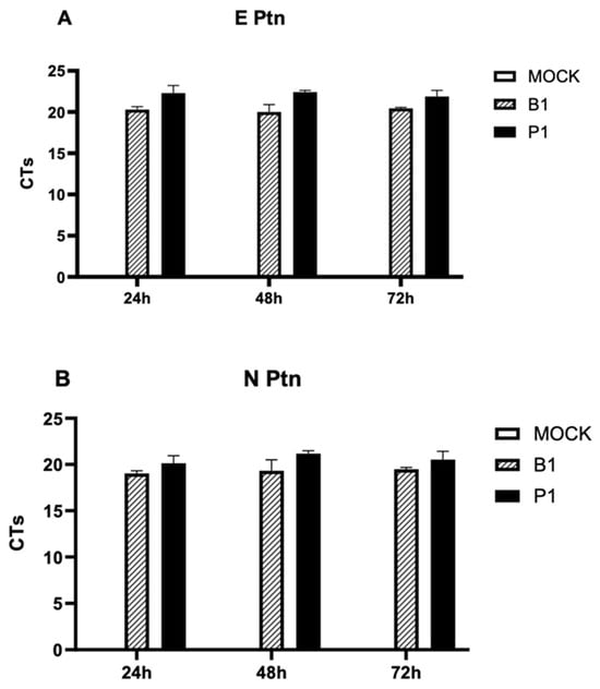 SARS-CoV-2 infection of mononuclear cells. Analysis of SARS-CoV-2 B.1 and P.1 replication cycles (cycle threshold, CT) based on (A) envelope genes and (B) nucleocapsid genes, following 24 h, 48 h and 72 h incubation periods. No statistically significant differences were observed between the groups. Statistical comparisons were executed against the control group using Student’s t-test. Multiple comparisons among the experimental groups were performed using two-way analysis of variance (ANOVA) followed by Dunnett’s test.