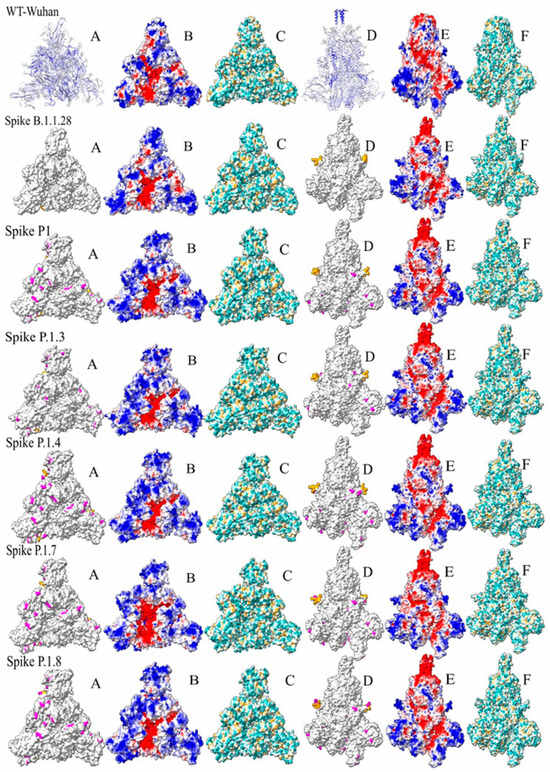 We meticulously examined the structural characteristics of the S protein, both in its wild-type form (Spike-WT) and in six distinct variants (including B.1.1.28, P.1, and its subvariants). Our focus encompassed exploring physicochemical and structural variances within immunogenic regions that prominently feature the domain responsible for interacting with the ACE-2 receptor. Notably, we evaluated parameters such as hydrophobicity, solvent-accessible surface (SAS) and electrostatic potential (EP) as key determinants of potential alterations (depicted in Figure 5).
