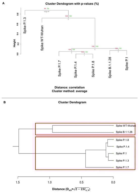 Comparative analysis of structural characteristics and clustering. (A) Clustering analysis of ASA and hydrophobicity: The pvclust package in RStudio was employed for clustering the analysis of residue models based on solvent-accessible surface (ASA) and hydrophobicity. Notably, the models of P.1.4, P.1.8, P.1 and B.1.1.28 exhibit smaller distances on their surfaces, and the model of P.1.7 displays a smaller distance relative to these clusters. In contrast, the P.1.3 and WT-Wuhan models clustered together, distant from the remaining analyzed models. (B) Cluster dendrogram of webPIPSA analysis: the webPIPSA analysis of electrostatic surfaces resulted in a cluster dendogram. This analysis reveals the clustering of the S protein from WT-Wuhan with the ancestral B.1.1.28 variant of the Gamma lineage. In contrast, the other variants are grouped together, indicating smaller distances among them. The red boxes indicates the number of clusters we determined for the analysis.