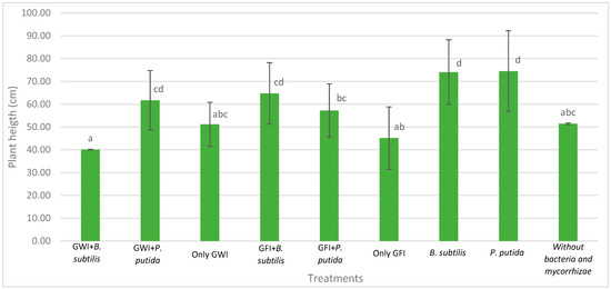 Plants not inoculated with rhizobacteria were placed on the negative side of the first component (PC1) and plants inoculated with B. subtilis and P. putida on the positive side. Plants inoculated with both rhizobacteria were associated with a greater increase in aerial and root biomass. On the other hand, in the case of plants inoculated with mycorrhizae, no clear trends in their behavior were observed. On the other hand, plants inoculated with B. subtilis and coastal mycorrhizae (GWI), which are positioned in all quadrants of the biplot, do not show a clear behavior in terms of indicators.