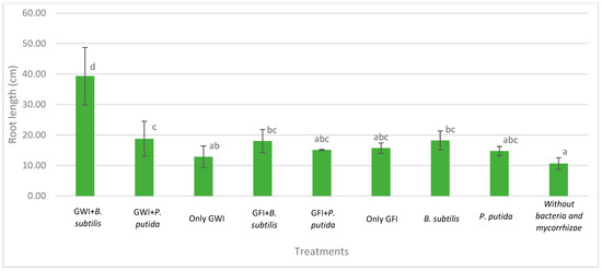 Effects of mycorrhizae and PGP bacteria on P. americana var. Zutano seedling root length after infection with P. cinnamomi. Averages with the same letter in a column are statistically similar according to Duncan’s test at a 95% confidence level. Bars indicate standard deviation.