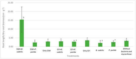 Effects of mycorrhizae and PGP bacteria on P. americana var. Zutano root length/root dry biomass after infection with P. cinnamomi. Averages with the same letter in a column are statistically similar according to Duncan’s test at a 95% confidence level. Bars indicate standard deviation.