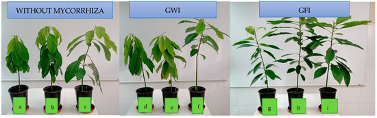 P. Americana var. Zutano appearance after co-inoculation with bacteria/mycorrhizae and infection with P. cinnamomi: (a) without mycorrhizae + without bacteria; (b) without mycorrhizae + B. subtilis; (c) without mycorrhizae + P. putida; (d) GWI + without bacteria; (e) GWI + B. subtilis; (f) GWI + P. putida; (g) GFI + without bacteria; (h) GFI + B. subtilis; (i) GFI + P. putida.