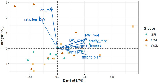 A PCA was performed on the biometric variables evaluated. In both inoculant treatments, with rhizobacteria and mycorrhizae, an explained variance of more than 77% was reached with the first two components. A biplot graph including variables together with observations is shown in Figure 8 and Figure 9. First, with respect to the variables, the existence of a higher correlation between root length and root exploration is observed, expressed in the relationship between root length and root biomass. On the other hand, there are high correlations between root fresh and dry weight, fresh and dry weight of the aerial part, number of leaves, plant height, and root moisture. Similarly, it was observed that the variables that contributed most to the PCA in the rhizobacteria and mycorrhizae treatments were root length and root moisture.