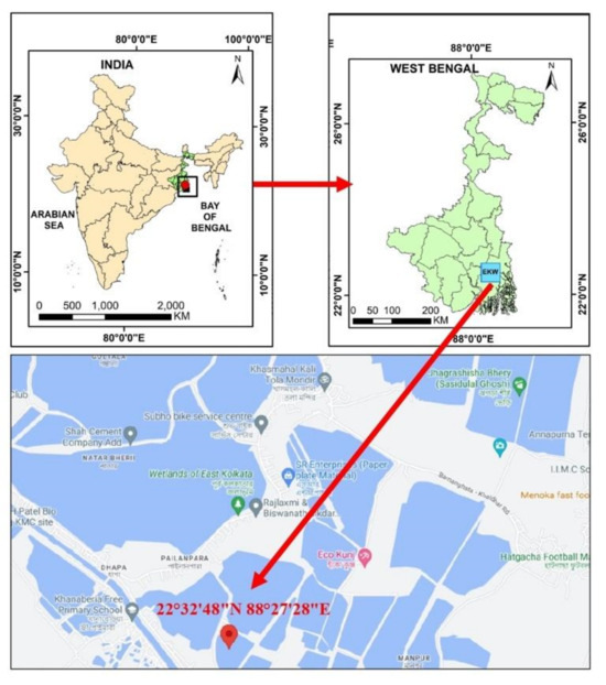 Monthly sampling were performed from January 2023 to June 2023 over a period of six months. Samples were collected from three waterbodies connected to the sewage canals (Figure 1). A total of 105 live bivalve mussels were gathered from the East Kolkata Wetlands (EKW), which is a recognized Ramsar site situated on the southeastern outskirts of Kolkata, India. The samples were carefully placed in sterile polythene bags and promptly transported to the laboratory in a chilled ice chamber. Subsequently, they were processed within a span of 2 h from the time of collection.