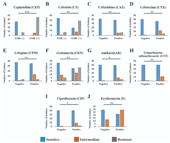 Antimicrobial resistance patterns across ESBL-producing and non-producing isolates differ significantly to varying degrees. The *** refers to p < 0.001, ** refers to p < 0.01 and * refers to p < 0.05.
