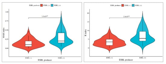 Phenotypic association of isolates between ESBL-producing and non-producing Aeromonas spp. The broader sections of the red violin, corresponding to ESBL negative isolates, signify a higher probability density of populations having a lower MAR index and R-score index. However, ESBL-positive Aeromonas spp. exhibit a higher MAR index and R index.