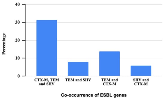 Among the 51 ESBL-positive isolates, a significant pattern emerged in terms of the co-occurrence of ESBL genes across different antibiotic classes (Table 4). In the macrolides category, 11 isolates (38%) were found to harbor all three ESBL genes simultaneously. Similarly, within the tetracyclines group, nine isolates (69%) exhibited this co-occurrence pattern. Moving on to the aminoglycosides category, eight isolates (35%) exhibited the presence of all three ESBL genes. The carbapenem and quinolones categories each had seven isolates (35%) that shared this co-occurrence of ESBL genes. Within the sulfonamides and phenicols categories, there were no instances of co-occurrence between blaSHV/blaCTX-M and blaTEM/blaCTX-M. The co-occurrence of blaTEM/blaCTX-M was identified in one isolate from each of the carbapenem, tetracycline, and quinolones categories and in two isolates (9%) from aminoglycosides and three isolates (10%) from quinolones. Additionally, one isolate (2%) from the tetracycline and macrolides categories, as well as two isolates from carbapenem and aminoglycosides, demonstrated the co-occurrence of blaSHV/blaCTX-M. Furthermore, the co-occurrence of blaTEM/blaCTX-M was identified in one isolate from each of the carbapenem, tetracycline, and quinolones categories. Moreover, in the aminoglycosides and quinolones categories, two isolates (9%) from aminoglycosides and three isolates (10%) from quinolones demonstrated this co-occurrence pattern.