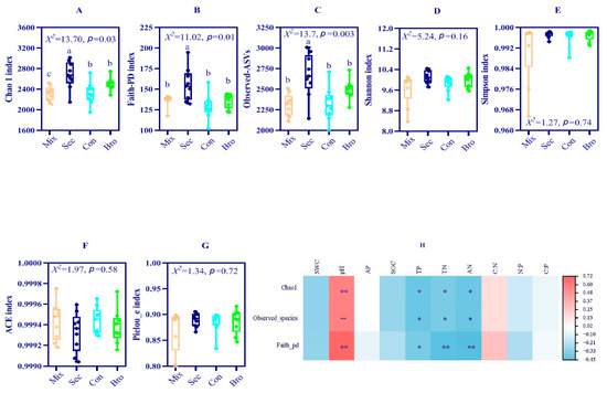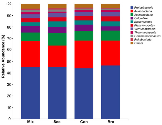 - Deng, J.; Yin, Y.; Zhu, W.; Zhou, Y. Variations in Soil Bacterial Community Diversity and Structures Among Different Revegetation Types in the Baishilazi Nature Reserve. Front. Microbiol. 2018, 9, 2874. [Google Scholar] [CrossRef] [PubMed]