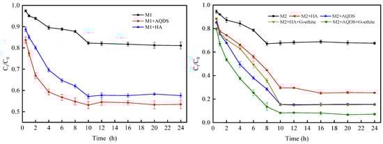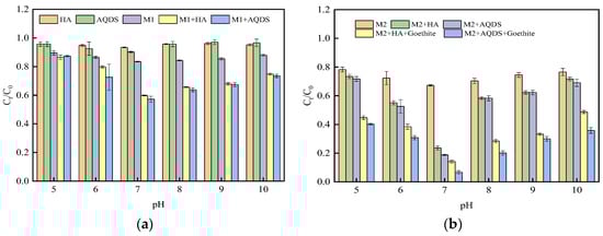 In the process of Cr(VI) reduction by S. oneidensis MR-1, the change in ion morphology at the active site of Cr(VI) reductase is a crucial factor influencing its reduction efficiency [45]. As depicted in Figure 2, within the pH range of 5 to 10, when the inoculum amount of S. oneidensis MR-1 was 10%, both binary systems composed of S. oneidensis MR-1 and HA or S. oneidensis MR-1 and AQDS exhibited higher intensity in reducing Cr(VI) compared to a single strain; similarly, a trend was also observed when the inoculum amount of S. oneidensis MR-1 was 20%. Figure 2a demonstrates that as the pH increases to 7, both single-strain systems and binary systems reach their maximum intensity in reducing Cr(VI). This phenomenon could be attributed to an increase in the number of active sites for Cr(VI) reductase under neutral conditions, thereby promoting the overall reduction process. Figure 2b reveals that under M2 conditions, S. oneidensis exhibited a stronger ability to reduce Cr(VI) compared with M1 conditions alone. Furthermore, under M2 conditions, the binary system showed more efficient reduction effects on Cr(VI) than a single strain did alone. The introduction of goethite into the system enabled S. oneidensis to achieve its maximum degradation capability towards Cr(VI). Therefore, adding ESs enhanced the reduction strength of S. oneidensis towards Cr (VI), while incorporating goethite further amplified it.