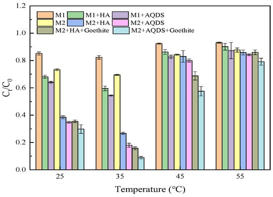 The reaction temperature exerted a significant influence on the microbial growth activity and reduction rate. As depicted in Figure 3, the reduction intensity of S. oneidensis towards Cr(VI) exhibited a notable increase as the temperature rose from 25 °C to 35 °C. However, once the temperature surpassed 35 °C, the reduction ability of S. oneidensis towards Cr(VI) started to decline. At 35 °C, each system demonstrated optimal Cr(VI) reduction efficacy, indicating its suitability for reduction purposes. Similar to pH, microorganisms also exhibited specific requirements for growth temperature. When the temperature was below 35 °C, microbial activity was constrained and failed to fully activate the sites responsible for Cr(VI) reductase activity; when it exceeded 35 °C, it hindered protein function, nucleic acids’ performance, and cellular components in S. oneidensis MR-1, leading to a decrease in reduction effectiveness. This pattern was observed consistently across different systems under both M1 and M2 conditions, with the ternary system exhibiting superior Cr(VI) reduction intensity.