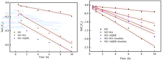 Based on the parameters provided in Table 1 and Table 2, the individual strain S. oneidensis MR-1 exhibited reduction rates of 0.0153 and 0.0372 for Cr(VI), indicating an enhanced capacity to reduce Cr(VI) with increasing inoculum size (M2 > M1), which correlated with the reaction rate and enhancement coefficient relationship. These findings were consistent with the results obtained from both the experiment investigating the effect of inoculum size and the kinetics study on reduction. Under M2 conditions, in the presence of Ess (HA, AQDS), it effectively reduced Cr(VI) compared to using only S. oneidensis MR-1 based on their correlation between reaction rates and enhancement coefficients. Introducing goethite further increases the reduction rate of Cr(VI) in a ternary system compared to a binary system and exhibits an almost twofold greater enhancement effect than before. It is confirmed that iron minerals promote the reduction of Cr(VI) by S. oneidensis MR-1 in the presence of Ess [41].