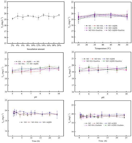 As depicted in Figure 6, the total Cr content in various systems exhibited minimal variation under different reaction conditions. Regardless of changes in pH, temperature, or time, the overall concentration of chromium remains relatively stable within the range of 19–20 mg·L−1, displaying negligible fluctuations compared to the initial concentration of 20 mg·L−1. This observation suggested a high degree of stability regarding the total chromium concentration within the reaction system. However, a slight disparity existed between the total chromium concentration and that of Cr(VI) at the beginning due to adsorption phenomena occurring on both S. oneidensis MR-1 and material surfaces.