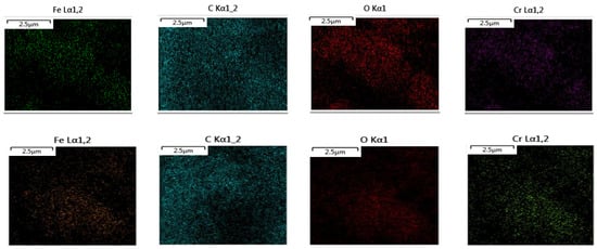 SEM-EDS analysis enables the observation of morphological characteristics as well as the determination of element composition and its distribution on material surfaces. The EDS spectrum of S. oneidensis MR-1, HA/AQDS, and goethite after Cr(VI) reduction is presented in Figure 8, revealing a uniform distribution of carbon (C), oxygen (O), iron (Fe), and other elements on the sample surface. This confirms the successful dispersion of synthesized goethite onto the material surface. Furthermore, chromium distribution mapping demonstrates an even distribution on the material surface during Cr(VI) reduction by S. oneidensis MR-1, HA/AQDS, and goethite.
