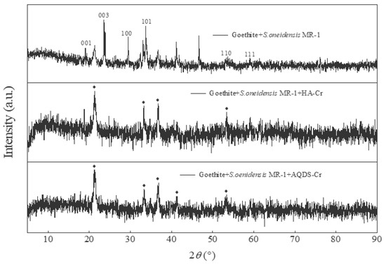 XRD analysis was conducted to investigate the crystal phase structure of samples before and after Cr(VI) reduction. The samples of S. oneidensis MR-1 and goethite and S. oneidensis MR-1, HA/AQDS, and goethite were subjected to XRD analysis after Cr(VI) treatment, and the obtained results were compared with standard cards for identification purposes. As shown in Figure 9, the diffraction peaks observed at 2θ = 19.24°, 23.60°, 29.56°, 53.55°, and 59.34° corresponded to (001), (003), (100), (101), (110), and (111) in PDF 81-0643, respectively, indicating the presence of high-quality goethite crystals in the prepared material. By analyzing the XRD patterns of S. oneidensis MR-1, HA/AQDS, and goethite after Cr(VI) treatment, it was observed that the intensity of diffraction peaks corresponding to planes 001 and 100 increased, while those corresponding to planes 003, 101, and 111 decreased significantly due to the Cr(VI) reduction process affecting the crystal structure of goethite. The involvement of acicular goethite in the Cr(VI) reduction reaction on the surface of S. oneidensis MR-1 was confirmed through a combination of SEM and EDS analyses.