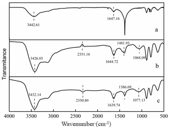 Fourier transform infrared spectrum ((a) S. oneidensis MR-1 and goethite; (b) S. oneidensis MR-1, HA, and goethite after Cr(VI) reduction; (c) S. oneidensis MR-1, AQDS, and goethite after Cr(VI) reduction).