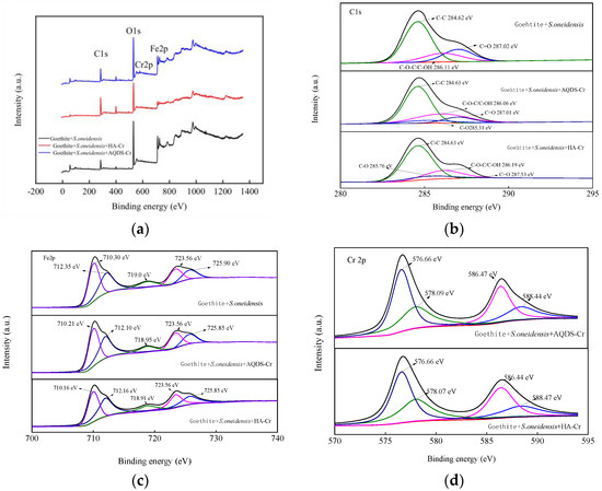 The changes in the valence states of major elements in different systems were investigated by analyzing the XPS spectra before and after reduction, and the results are shown in Figure 11. Prior to Cr(VI) reduction, the S. oneidensis MR-1 and goethite samples primarily consisted of C, O, and Fe. However, following Cr(VI) reduction, the XPS spectra of S. oneidensis MR-1, HA/AQDS, and goethite samples exhibited a prominent chromium (Cr) peak. The Fe 2p and C 1s spectra are presented in Figure 11a–c, respectively. It is noteworthy that both before and after reduction, the goethite and S. oneidensis MR-1 samples contained oxygen-containing functional groups such as C-O-C/C-OH and C=O, which played a crucial role in the Cr(VI) reduction process. For a more detailed analysis of the Fe 2p photoelectron peak, please refer to Figure 11c: specifically, the range of 710–712.3 eV corresponds to Fe 2p1/2, while the range of 723–726 eV corresponds to Fe 2p3/2 [49]. Notably, peaks at energies of approximately 725.9 eV, 712.10 eV, and 718.90 eV indicated Fe(III), whereas peaks at energies around 723.56 eV and 710.21 eV represented Fe(II). Regarding chromium species identification, the energy range between 576 and 578 eV is associated with the Cr 2p3/2 orbital, and the range between 586 and 589 eV corresponds to Cr [50,51]. As shown in Figure 11d, the peaks at 588.44 eV and 578.07 eV are related to Cr(VI) compounds, while the peaks at 576.66 eV and 586.47 eV are related to Cr(III) compounds. This result was roughly consistent with the above Fe 2p analysis results. The research findings demonstrated that S. oneidensis MR-1 effectively enhanced the surface availability of reduction sites through Fe(III) reduction to Fe(II). In conjunction with the total chromium analysis, we observed rapid transfer to Cr(VI) leading to its reduction to Cr(III), which significantly contributes to the enhanced removal efficiency of Cr(VI). This conclusion was derived from a comprehensive analysis of reduction kinetics.