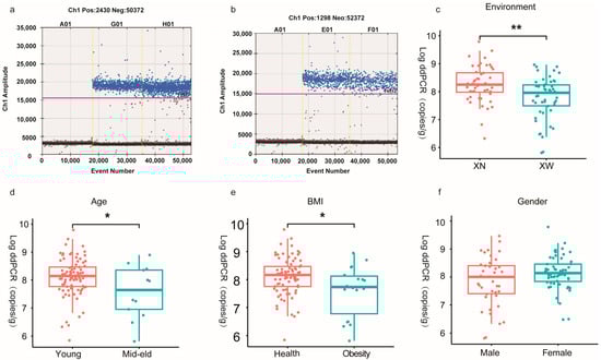 Absolute quantification of bifidobacteria (the LOG value calculated by dd-PCR): (a,b) Number of droplets distribution of Bifidobacterium in the intestinal tract of college students and social workers; The colored line is the dividing line between positive droplets and negative droplets. The positive droplets are on the line and the negative droplets are off the line. (c–f) Box plot showing the number of bifidobacteria based on the living environment, age, BMI, and gender. The “*” represents the intensity of significant difference (*, p < 0.05; **, p < 0.01).