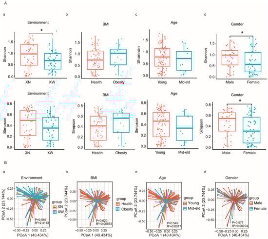 Microbial diversity: (A) Shannon index and Simpson index showed the α diversity of each group under different groups: (a) is the Shannon index and Simpson index of different living environment; (b) is the Shannon index and Simpson index of different BMI; (c) is the Shannon index and Simpson index of different ages; (d) is the Shannon index and Simpson index of different genders. (B) Principal coordinate analysis (PCoA) scores of the two groups under different influencing factors. (* p < 0.05); B (a–d) is the PCoA diagram of different living environment, BMI, age and gender groups.
