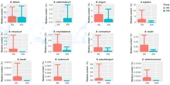 The Wilcoxon test was applied to analyze the differential species of intestinal bifidobacteria, identifying a total of 12 strains with significant differences (p < 0.05). These strains included B. angulatum, B. moukalabense, B. stellenboschense, B. reuteri, B. merycicum, B. longum, B. ruminantium, B. eulemuris, B. bifidum, B. pseudolongum, B. biavatii, and B. callitrichidarum. Noteworthy findings included a significantly higher content of B. callitrichidarum in the XW group than in the XN group (XW vs. XN: 0.100% ± 0.310% vs. 0.003% ± 0.006%). In the XN group, the following species were found to have higher levels compared to the XW group: B. angulatum (XN vs. XW: 2.763% ± 7.816% vs. 0.190% ± 1.211%), B. moukalabense (XN vs. XW: 0.100% ± 0.310% vs. 0.100% ± 0.515%), B. stellenboschense (XN vs. XW: 0.002% ± 0.004% vs. 0% ± 0%), B. reuteri (XN vs. XW: 0.351% ± 0.004% vs. 0% ± 0%), B. merycicum (XN vs. XW: 0.093% ± 0.393% vs. 0.0011% ± 0.007%), B. longum (XN vs. XW: 2.688% ± 3.180% vs. 1.045% ± 3.431%), B. ruminantium (XN vs. XW: 0.701% ± 1.956% vs. 0.161% ± 0.495%), B. eulemuris (XN vs. XW: 0.001% ± 0.003% vs. 0% ± 0%), B. bifidum (XN vs. XW: 11.839% ± 19.041% vs. 10.490% ± 22.273%), B. pseudolongum (XN vs. XW: 0.054% ± 0.364% vs. 0% ± 0%), B. biavatii (XN vs. XW: 0.0003% ± 0.0011% vs. 0% ± 0%), and B. callitrichidarum (XN vs. XW: 0.003% ± 0.006% vs. 0.010% ± 0.310%). Among them, B. biavatii, B. eulemuris, B. pseudolongum, and B. stellenboschense were exclusively present in the XN group (Figure 5).