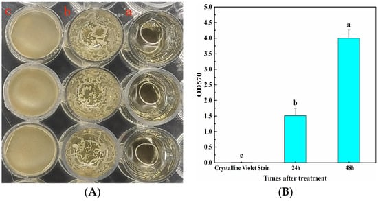 Plates were left at 28 °C for 48 h, the liquid LB remained clarified, and the surface was transparent, without any bacterial film formation observed (Figure 2A-a). After incubation for 24 h, there was an accumulation of bacteria on the surface, accompanied by the formation of yellow striped bacterial film aggregates (Figure 2A-b). After incubation for 48 h, a dense and tight yellow bacterial membrane was formed on the surface and folds appeared (Figure 2A-c). This indicated that CSUFT-BV4 has the ability of biofilm formation. According to the quantitative results (Figure 2B), the OD570 value after incubation for 48 h was 3.996, which was significantly higher than the amount of biofilm after incubation for 24 h.
