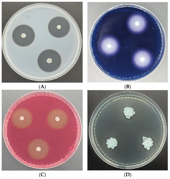The ability of CSUFT-BV4 to produce protease (A), amylase (B), cellulase (C), and β-1,3-glucanase (D).