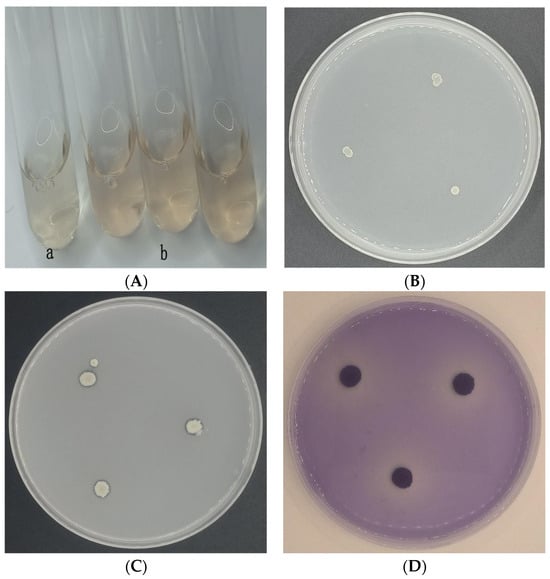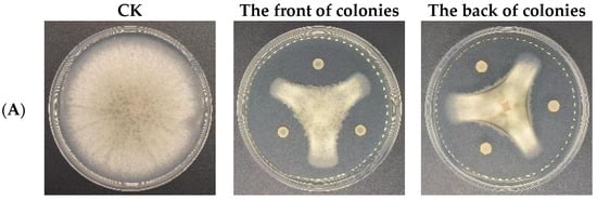 The production of various lytic enzymes and bioactive metabolites is an important mechanism for many antibiotic bacteria [23]. CSUFT-BV4 was cultured as described in Section 2.3 and diluted to 108 CFU/mL with sterilized LB liquid medium. An amount of 2 μL of the CSUFT-BV4 fermentation broth was pipetted and added dropwise to the three vertices of the protease, amylase, cellulase, and β-1,3-glucanase assay plates in the form of an equilateral “Δ”, and the plates of each group were cultured in a thermostatic incubator, 28 °C. Each group was repeated three times, and the plates were observed to determine whether transparent circles appeared after 2–4 days [24,25].