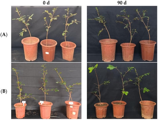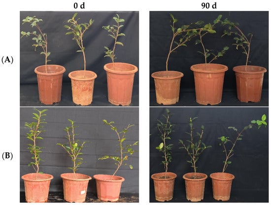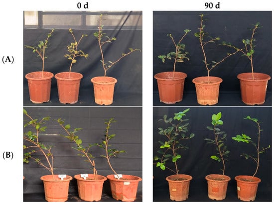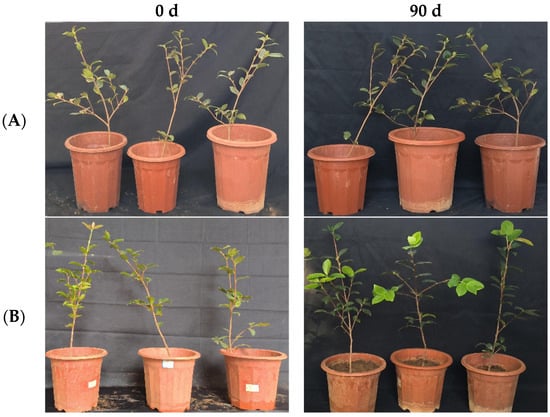 In the greenhouse experiment, statistical analysis showed significant differences in stem width between 0, 45, and 90 days in “Huajin” C. oleifera cultivars. The original stem widths of C. oleifera in the LB medium control and 108 CFU/mL CSUFT-BV4 fermentation broth treatment groups were 6.4 mm and 5.4 mm, and after 90 days, the values were 6.6 mm and 6.7 mm, respectively. The stem widths of the treatment groups increased by 1.1 mm compared to the control groups (Figure 13A). The original plant height values of C. oleifera in the LB medium control and 108 CFU/mL CSUFT-BV4 fermentation broth treatment groups were 59.4 cm and 51.6 cm, respectively, and after 90 days, the heights were 63.8 cm and 63.3 cm, respectively. The plant heights in the treatment groups increased by 7.3 cm compared to the control groups (Figure 13B). There were no significant differences in maximum leaf area between 0, 45, and 90 days in “Huajin” C. oleifera cultivars. The original maximum leaf areas of the test C. oleifera in the LB medium control and 108 CFU/mL CSUFT-BV4 fermentation broth treatment groups were 18.7 cm2 and 19.7 cm2, respectively, and after 90 days, the values were 19.2 cm2 and 21.1 cm2, respectively. The maximum leaf area increased by 1.4 cm2 in the treated groups and 0.9 cm2 compared to the control groups (Figure 13C). “Huajin” C. oleifera cultivars were inoculated with 108 CFU/mL of CSUFT-BV4 fermentation broth by root irrigation for 90 days, and the growth characterization of the plants is shown in Figure 14.