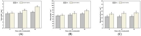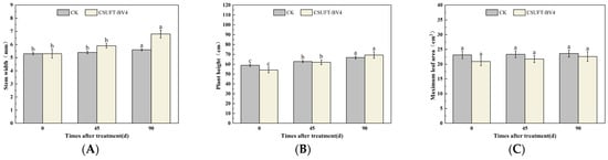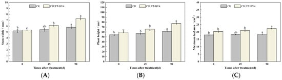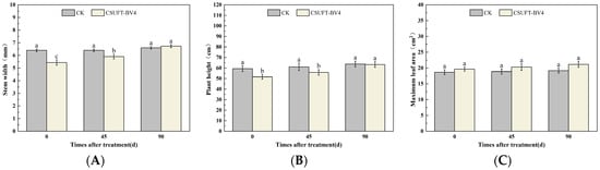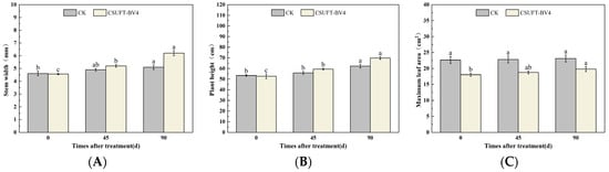 Effect on growth of “Huajin” C. oleifera cultivars by root irrigation method. (A) Stem width; (B) plant height; (C) maximum leaf area. CK: LB control; CSUFT-BV4: 108 CFU/mL fermentation broth. Error bars indicate standard deviation. Different lowercase letters above each column represent significant differences according to Duncan’s test (p < 0.05).
