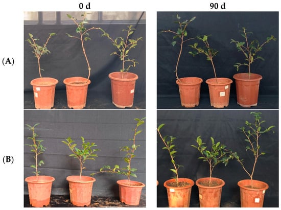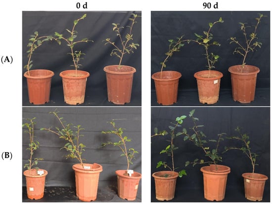 In the greenhouse experiment, the original stem widths of C. oleifera in the LB medium control and 108 CFU/mL CSUFT-BV4 fermentation broth treatment groups were 5.3 mm, and after 90 days, the values were 5.6 mm and 6.8 mm, respectively. The stem width of the treatment groups increased by 1.2 mm compared to the control groups (Figure 7A). Statistical analysis showed significant differences in plant height between 0, 45, and 90 days in “Huashuo” C. oleifera cultivars. The original plant height values of C. oleifera in the LB medium control and 108 CFU/mL CSUFT-BV4 fermentation broth treatment groups were 58.9 cm and 54.2 cm, respectively, and after 90 days, the heights were 66.8 cm and 69.37 cm, respectively. The plant height in the treatment groups increased by 7.3 cm compared to the control groups (Figure 7B). There were no significant differences in maximum leaf area between 0, 45, and 90 days in “Huashuo” C. oleifera cultivars. The original maximum leaf areas of the test C. oleifera in the LB medium control and 108 CFU/mL CSUFT-BV4 fermentation broth treatment groups were 23.13 cm2 and 20.93 cm2, respectively, and after 90 days, the values were 23.62 cm2 and 22.59 cm2, respectively. The maximum leaf area increased by 1.66 cm2 in the treated groups and 1.17 cm2 compared to the control groups (Figure 7C). “Huashuo” C. oleifera cultivars were inoculated with 108 CFU/mL of CSUFT-BV4 fermentation broth by root irrigation for 90 days, and the growth characterization of the plants is shown in Figure 8.